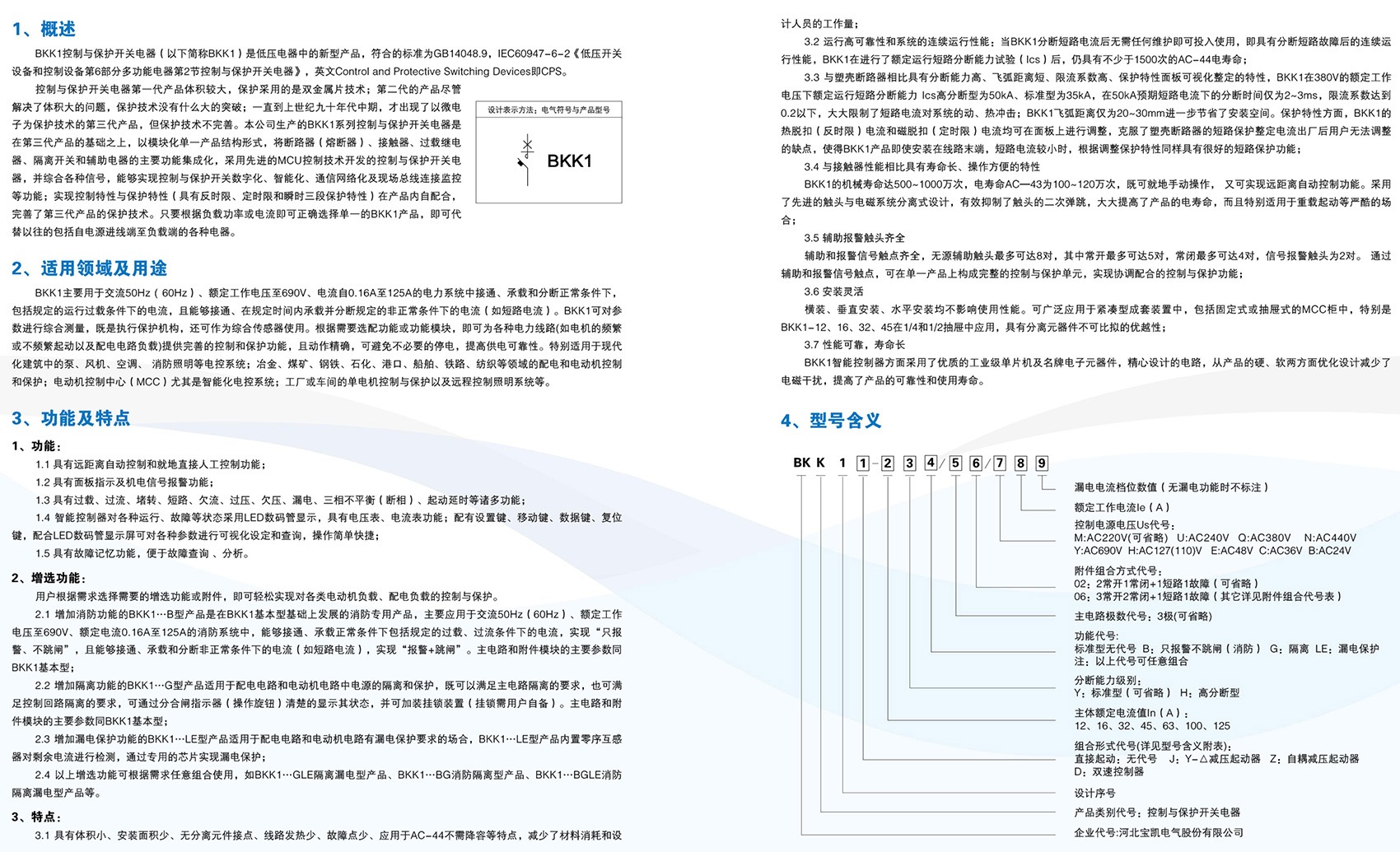 BKK1系列節制與掩護開關電器首要用于交換50Hz(60Hz)、額外電壓至690V、額外任務電流自0.4A至125A的電力體系中接通、承載和分斷一般前提(包含劃定的過載前提)下的電流,且能夠或許或許接通、承載并分斷劃定的非一般前提(如短路)下的電流。BKK1系列接納模塊化的單一產物布局情勢,集成了傳統的斷路器(熔斷器)、打仗器、過載(或過流、斷相)掩護繼電器、起動器、斷絕器、機電綜合掩護器等多種傳統的分手元器件。產物具備遠間隔主動節制與當場人力節制兼有的體例停止節制操縱的功效,具備調和共同的時候-電流掩護特征,具備節制與掩護自共同、短路后持續運轉,具備分斷才能高,飛弧間隔小、壽命長,具備掩護整定電流都可調的特征,操縱便利、配套模塊多樣齊備等長處,能夠或許完成對電念頭負載、配電負載的節制和掩護。產物合適GB/T 14048.9《節制與掩護開關電器》規范。