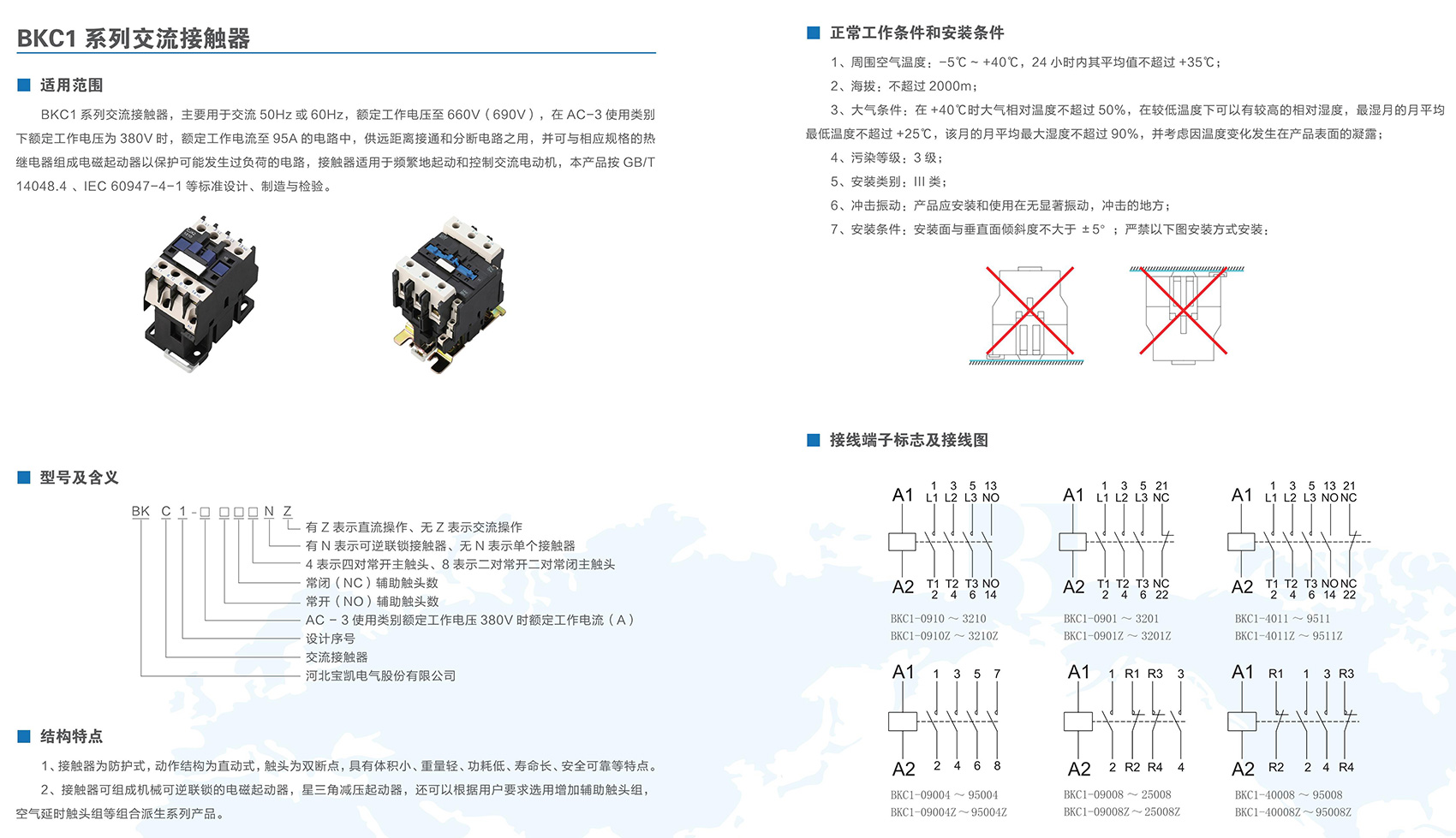 BKC1-09~95系列交換打仗器,首要用于交換50Hz(或60Hz),額外絕緣電壓為690V,在AC-3利用種別下額外任務電壓為380V時額外任務電流為9A~95A的電路中,供遠間隔接通與分斷電路及頻仍起動、節制交換電念頭;并可與恰當的熱過載繼電器構成電磁起動器,以掩護能夠產生過負荷的電路。產物合適規范:IEC 60947-4,GB/T 14048.4,IEC 60947-5,GB/T 14048.5