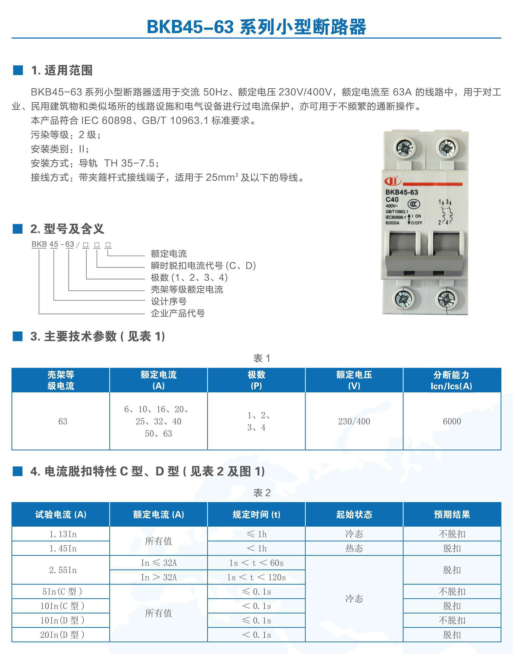 BKB45-63系列小型斷路器合用于交換50Hz,額外電壓至400V,額外電流6~63A,額外絕緣電壓400V的體系線路中。用來對修建電廠、變電站、電信、交通、冶金、工礦業等及近似場合的體系線路、電氣裝備停止過電流掩護,也能夠用于不頻仍的通斷操縱。合用于非專業職員利用且不須要停止掩護。本產物合適GB/T 10963.1、IEC 60898-1規范。
