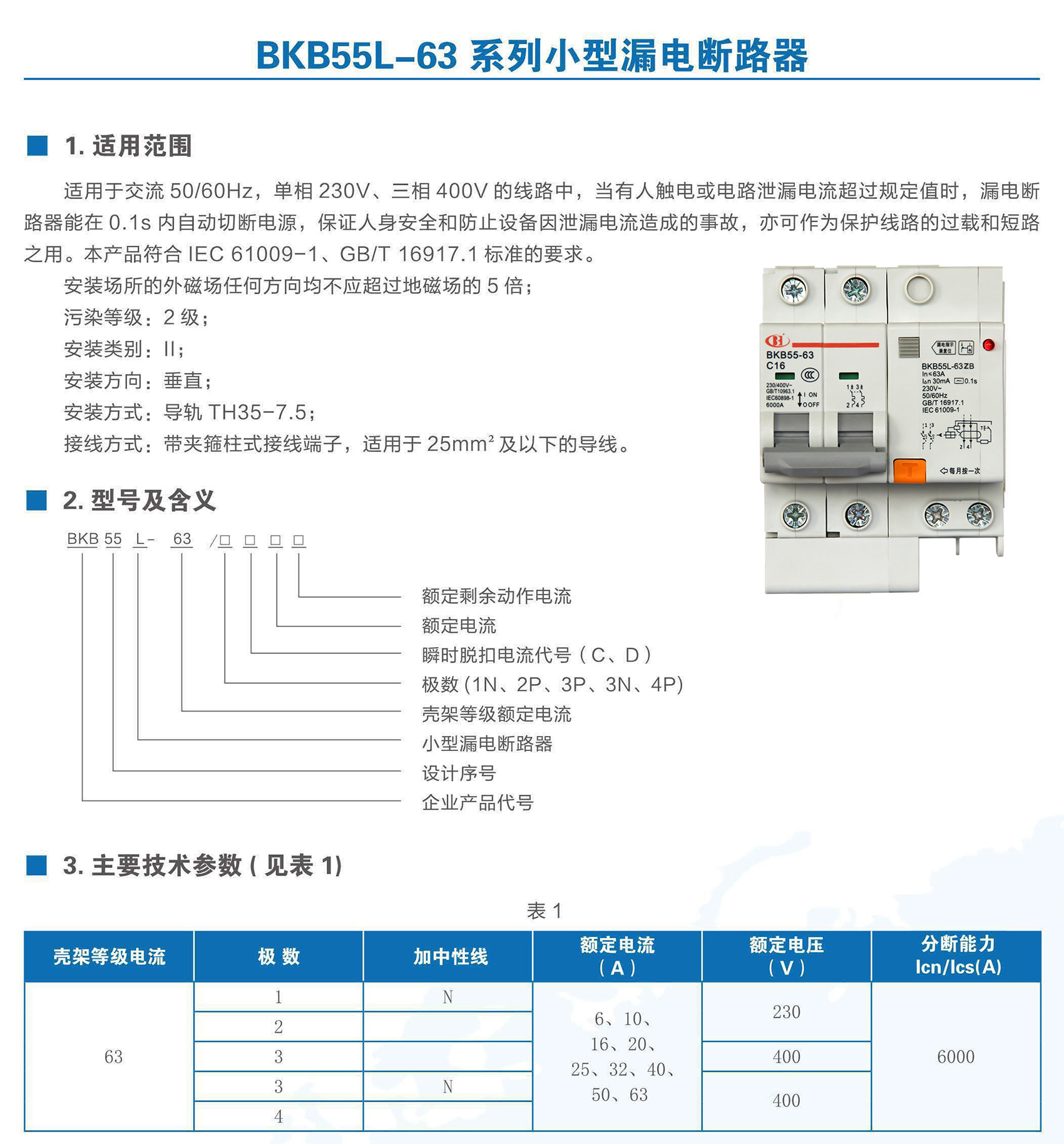 BKB55L-63ZB系列自診斷小型泄電斷路器合用于交換50/60Hz,額外電壓至230V,額外電流至63A的線路中,作為人身觸電和裝備泄電掩護之用;殘剩電流舉措功效自診斷、生效報警,當產物泄電掩護功效呈現非常時會經由過程報警模塊提示用戶;并可用于線路和電氣裝備的過載及短路掩護。本產物合適GB/T 16917.1、IEC 61009-1規范。
