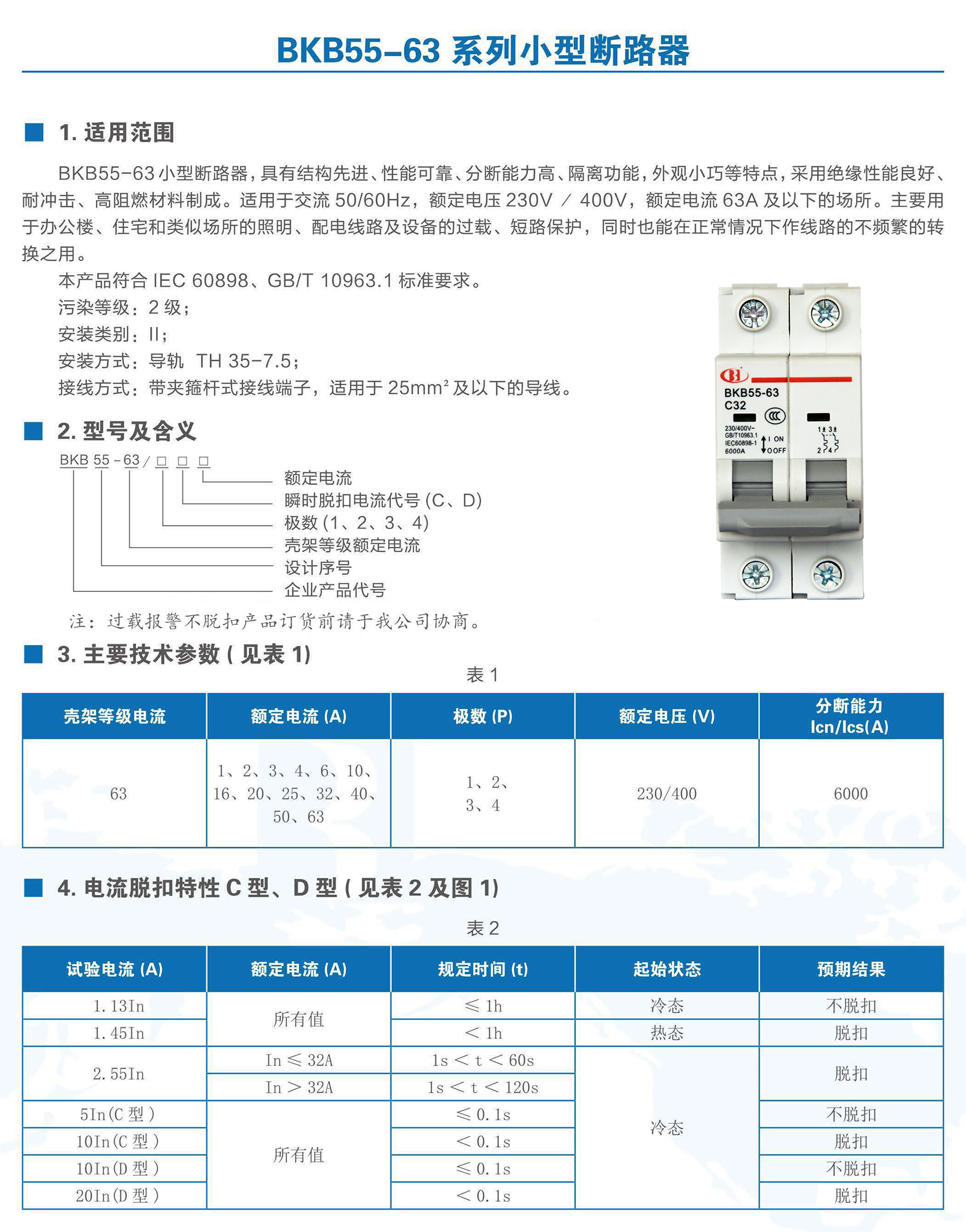 BKB55-63系列小型斷路器合用于交換50/60Hz,額外電壓至400V,額外電流1~63A,額外絕緣電壓500V的體系線路中。用來對修建電廠、變電站、電信、交通、冶金、工礦業等及近似場合的體系線路、電氣裝備停止過電流掩護,也能夠用于不頻仍的通斷操縱。合用于非專業職員利用且不須要停止掩護。本產物合適GB/T 10963.1、IEC 60898-1規范。