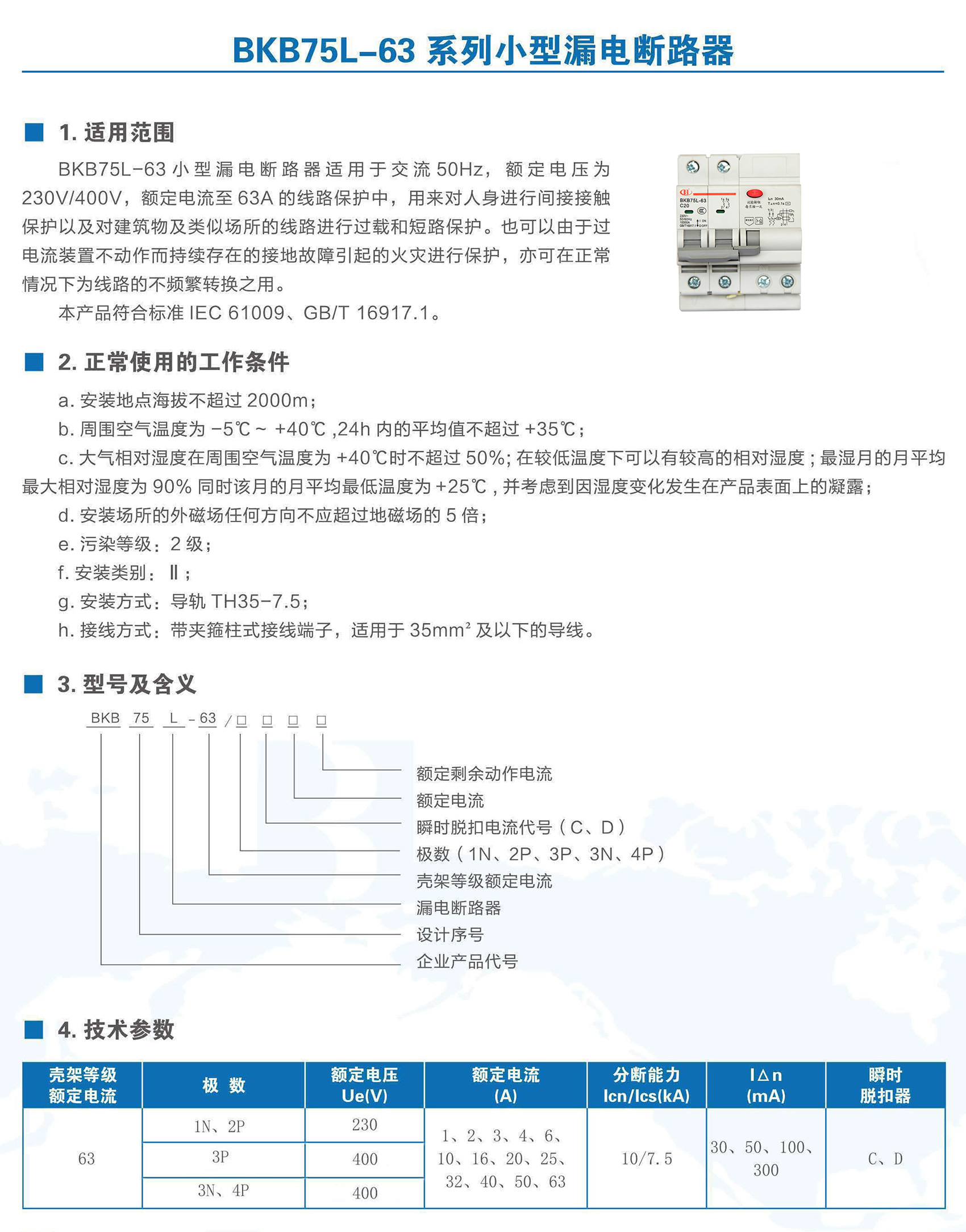 BKB75L-63系列帶殘剩電流掩護小型斷路器合用于交換50/60Hz、額外電壓至400V,額外電流1~63A 的線路中。作為人身觸電和裝備泄電掩護之用,并可用于線路和電氣裝備的過載和短路掩護。在一般環境下亦可用于不頻仍的通斷操縱。本產物合適GB/T 16917.1、IEC 61009-1規范。